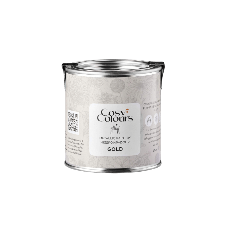 CosyColours Metallic Paint Gold sorgt für das gewisse Etwas. Mit dem robusten, warmen und schimmernden Goldlack kannst Du Akzente setzen und auch ganze Möbelstücke “vergolden”. Er ist auch auf glatten Untergründen strapazierfähig und abwaschbar.